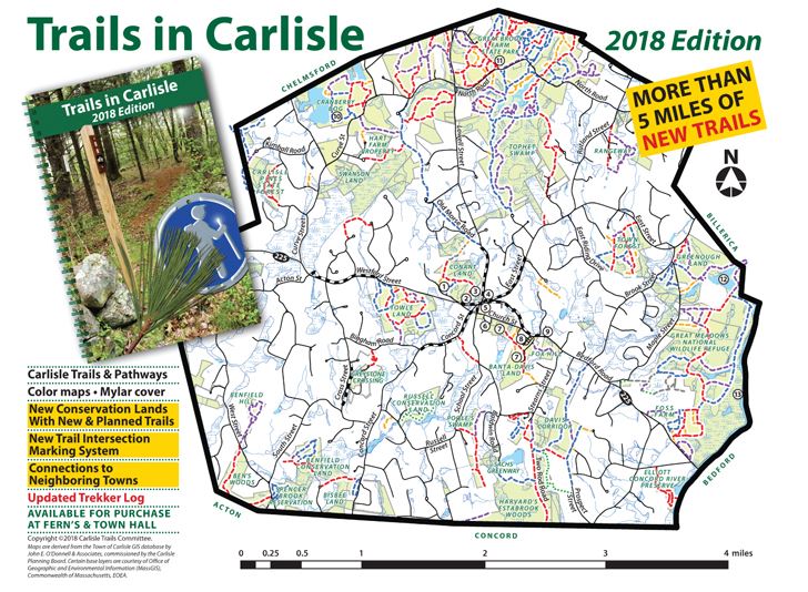The 2018 Edition is the 9th version of “Trails In Carlisle.” It marks the 33rd anniversary of the Trails Committee and the 58th year of the Carlisle Conservation Foundation. This 68-page Mylar-covered trail book includes new conservation lands with new and planned trails and provides much information about the trails, how to access the conservation parcels, where to park, fauna, flora, and land features. The full-color trail maps include new trail intersection markers. It is available for purchase from Trails Committee members, at the Carlisle Town Hall for $10, Pedal Power in Acton, and seasonally available at Clark Farm Market.